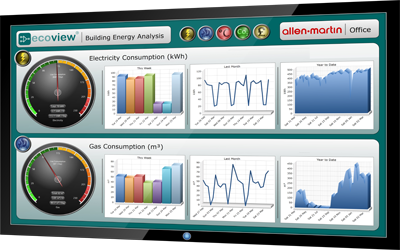 ecoview is a custom graphics display which can be viewed in multiple locations at once throughout a building from PCs, tablets and information displays, so that all building occupants can be aware of their effect on the environment. Daily, weekly, monthly and annual energy consumption can be displayed along with live calculations showing carbon footprint data and amount of CO2 produced.